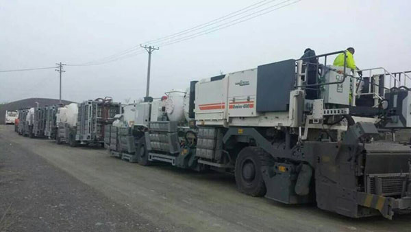 就地热再生工艺,适用于沥青路面面层的大规模快速维修。不论是高速公路还是城市道路,各种等级的沥青路面均适用。沥青路面由加热机和再生机上的红外加热元件进行加热,最大工作深度达6cm。然后,加热了的路面由旋转式耙松装置耙松下来。在复拌工艺下,耙松下的沥青路面材料在机载双轴搅拌锅内与校正用新加沥青混合料和/或再生剂,进行均匀的拌合。拌合后的再生混合料,由再生机的搅龙和熨平板重新摊铺成型。再生复拌工艺下,现有沥青路面首先得到再生,而同时一个全新的表面层被一次性的摊铺到新再生层上。也就是说,现有沥青层的再生过程和全新材料面层的加铺过程,由再生机组一次性完成。
